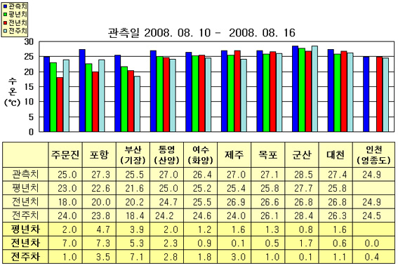 o 금주(2008.08.10~2008.08.16)의 한반도 연안 표면수온은 동해 연안역에서 섭씨 25~28도, 남해 연안역 26~28도, 서해 연안역에서 24~29도 내외로 나타납니다. o 평년에 비해 동해 연안역은 2~4도 높게, 남해 연안역은 1~2도 높게, 서해 연안역은 1~1.5도 높게 나타납니다. o 전년에 비해 동해 연안역은 5~7도 높게, 남해 연안역은 1~2도 높게, 서해 연안역은 0.5~1.5도 높게 나타납니다.