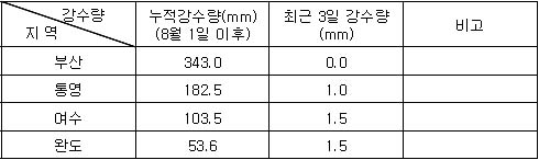 (Aug. 20. 2008) 2. 기상전망 (기상청 예보 자료) * 바람 및 파고 전망 오늘 남해서부에서 바람은 서풍 내지 북서풍이 5~8m/sec, 파고는 0.5~1.0m 내외로 예상되며, 남해동부에서는 서풍 내지 북서풍이 7~11m/sec, 파고는 1.0~1.5m로 예상됨. 내일은 남해서부에서 바람은 북동풍 내지 남동풍이 3~7m/sec, 파고는 0.5m 내외로 예상되며, 남해동부에서 바람은 북서풍 내지 북동풍이 8~12m/sec, 파고는 1.0~2.0m로 예상됨. * 특보 발효 현황 ㅇ 강풍주의보: 울릉도독도 ㅇ 풍랑주의보: 동해중부전해상 * 강수량