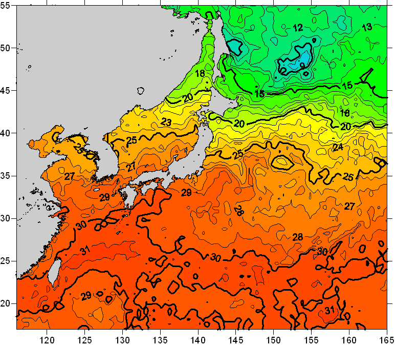 o 2008년 08월 19일 북서태평양 광역해양 수온분포 입니다. o 아래 위성 수온분포도는 국립수산과학원(NFRDI, Korea)과 일본동북대학교(Tohoku University, Japan)가 공동연구개발 진행중, 1차 연구결과인 것으로 구름의 영향을 배제한 신기술의 수온정보입니다.