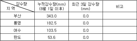 (Aug. 21. 2008) 2. 기상전망 (기상청 예보 자료) * 바람 및 파고 전망 오늘 남해서부에서 바람은 북동풍 내지 남동풍이 7~11m/sec, 파고는 1.0~1.5m 내외로 예상되며, 남해동부에서는 북동풍 내지 남동풍이 8~12m/sec, 파고는 1.0~2.0m로 예상됨. 내일은 남해서부에서 바람은 남동풍 내지 남서풍이 8~12m/sec, 파고는 1.0~2.0m 내외로 예상되며, 남해동부에서 바람은 남동풍 내지 남서풍이 7~11m/sec, 파고는 0.5~1.5m로 예상됨. * 특보 발효 현황 ㅇ 풍랑주의보: 동해전해상 * 강수량
