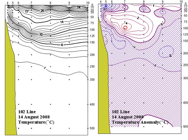 ㅇ 2008년 8월 14일 국립수산과학원 동해수산연구소에서 조사한 102선(포항 동방)의 수직수온분포도 및 평년편차도 입니다. ㅇ 표면수온은 25℃ 내외의 분포를 보였고 수온약층은 10~200m 층에서 강하게 형성되었으며, 250m 이심층에서는 1℃ 내의 균질한 분포를 보였습니다. ㅇ 평년에 비하여 정점 5~9사이의 50~150m 층에서 2~4℃ 고온상을 보였으며, 그 외의 대부분 수층에서는 1~2℃ 저온상을 보였습니다.