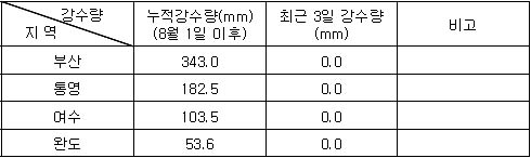 (Aug. 22. 2008) 2. 기상전망 (기상청 예보 자료) * 바람 및 파고 전망 오늘 남해서부에서 바람은 남동풍 내지 남서풍이 10~14m/sec, 파고는 2.0~3.0m 내외로 예상되며, 남해동부에서는 남동풍 내지 남서풍이 10~16m/sec, 파고는 2.0~4.0m로 예상됨. 내일은 남해서부에서 바람은 서풍 내지 북서풍이 10~16m/sec, 파고는 2.0~3.0m 내외로 예상되며, 남해동부에서 바람은 남서풍 내지 북서풍이 10~14m/sec, 파고는 2.0~3.0m로 예상됨. * 특보 발효 현황 ㅇ 강풍주의보: 서해5도, 흑산도홍도 ㅇ 호우주의보: 제주도(제주도산간, 제주도서부, 제주도남부) ㅇ 풍랑주의보: 서해남부먼바다, 서해중부전해상, 남해동부먼바다, 남해서부먼바다, 제주도전해상 * 강수량
