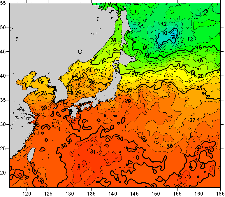 o 2008년 08월 21일 북서태평양 광역해양 수온분포 입니다. o 아래 위성 수온분포도는 국립수산과학원(NFRDI, Korea)과 일본동북대학교(Tohoku University, Japan)가 공동연구개발 진행중, 1차 연구결과인 것으로 구름의 영향을 배제한 신기술의 수온정보입니다.