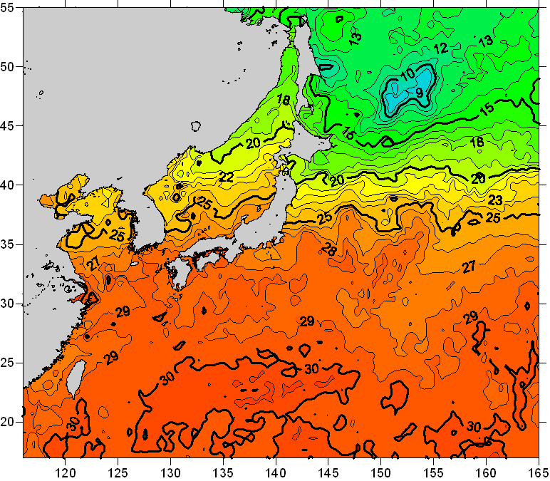 o 2008년 08월 22일 북서태평양 광역해양 수온분포 입니다. o 아래 위성 수온분포도는 국립수산과학원(NFRDI, Korea)과 일본동북대학교(Tohoku University, Japan)가 공동연구개발 진행중, 1차 연구결과인 것으로 구름의 영향을 배제한 신기술의 수온정보입니다.