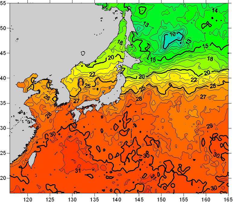 o 2008년 08월 23일 북서태평양 광역해양 수온분포 입니다. o 아래 위성 수온분포도는 국립수산과학원(NFRDI, Korea)과 일본동북대학교(Tohoku University, Japan)가 공동연구개발 진행중, 1차 연구결과인 것으로 구름의 영향을 배제한 신기술의 수온정보입니다.