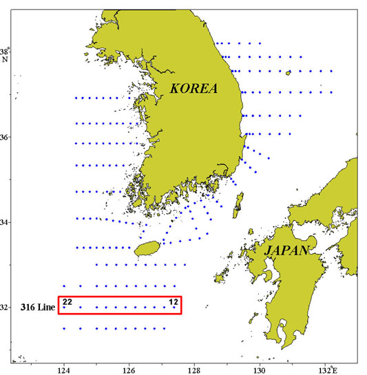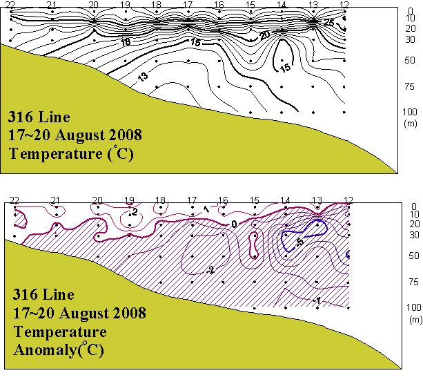 ㅇ 2008년 8월 17~20일 국립수산과학원 해양연구팀에서 조사한 동중국해 북부해역(316선)의 수온 수직분포도와 평년편차도입니다. ㅇ 표층주변인 20m 층을 중심으로 강한 수온전선의 형성이 나타났으며, 정점 18~17의 저층 주변에는 12℃ 이하의 상대적으로 낮은 수온의 수괴가 보여졌습니다. ㅇ 평년에 비하여 표층은 1~2℃ 고수온을 보인 반면, 표층을 제외한 대부분의 수층에서는 1~5℃ 저온상을 나타내었습니다.