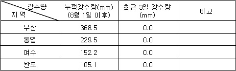 (Aug. 27. 2008) 2. 기상전망 (기상청 예보 자료) * 바람 및 파고 전망 오늘 남해서부에서 바람은 북서풍 내지 북동풍이 6~9m/sec, 파고는 0.5~1.0m 내외로 예상되며, 남해동부에서는 북서풍 내지 북동풍이 8~12m/sec, 파고는 1.0~2.0m로 예상됨. 내일은 남해서부에서 바람은 북서풍 내지 북동풍이 6~9m/sec, 파고는 0.5~1.0m 내외로 예상되며, 남해동부에서 바람은 북서풍 내지 북동풍이 7~11m/sec, 파고는 1.0~2.0m로 예상됨. * 특보 발효 현황 ㅇ 없 음 * 강수량