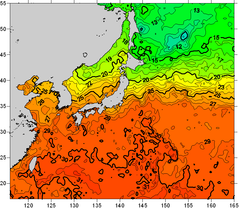 o 2008년 08월 26일 북서태평양 광역해양 수온분포 입니다. o 아래 위성 수온분포도는 국립수산과학원(NFRDI, Korea)과 일본동북대학교(Tohoku University, Japan)가 공동연구개발 진행중, 1차 연구결과인 것으로 구름의 영향을 배제한 신기술의 수온정보입니다.