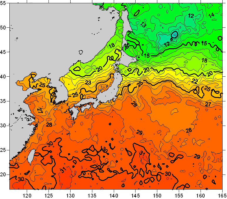 o 2008년 08월 28일 북서태평양 광역해양 수온분포 입니다. o 아래 위성 수온분포도는 국립수산과학원(NFRDI, Korea)과 일본동북대학교(Tohoku University, Japan)가 공동연구개발 진행중, 1차 연구결과인 것으로 구름의 영향을 배제한 신기술의 수온정보입니다.