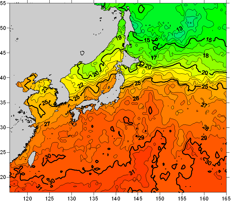 o 2008년 09월 02일 북서태평양 광역해양 수온분포 입니다. o 아래 위성 수온분포도는 국립수산과학원(NFRDI, Korea)과 일본동북대학교(Tohoku University, Japan)가 공동연구개발 진행중, 1차 연구결과인 것으로 구름의 영향을 배제한 신기술의 수온정보입니다.