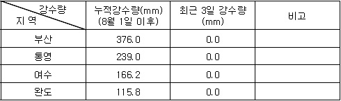 (Sept. 9. 2008) 2. 기상전망 (기상청 예보 자료) * 바람 및 파고 전망 오늘 남해서부에서 바람은 북동풍 내지 남동풍이 7~11m/sec, 파고는 0.5~1.5m 내외로 예상되며, 남해동부에서는 북동풍 내지 남동풍이 8~12m/sec, 파고는 1.0~2.0m로 예상됨. 내일은 남해서부에서 바람은 북동풍 내지 남동풍이 7~11m/sec, 파고는 0.5~1.5m 내외로 예상되며, 남해동부에서 바람은 북동풍 내지 남동풍이 6~9m/sec, 파고는 0.5~1.0m로 예상됨. * 특보 발효 현황 ㅇ 없 음 * 강수량