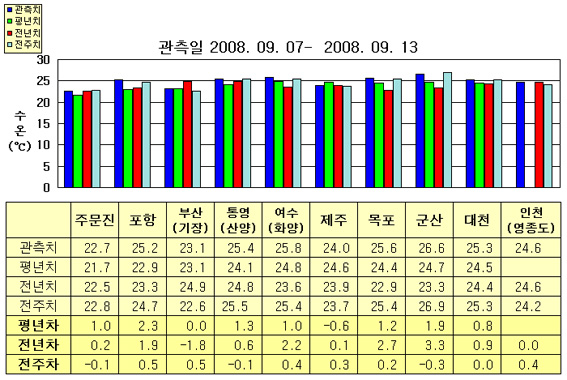 o 금주(2008.09.07~2008.09.13)의 한반도 연안 표면수온은 동해 연안역에서 섭씨 22~26도, 남해 연안역 24~26도, 서해 연안역에서 24~27도 내외로 나타납니다. o 평년에 비해 부산 비슷함을 제외한 동해 연안역은 1~2.5도 높게, 제주 0.5도 낮음을 제외한 남해 연안역은 1~1.5도 높게, 서해 연안역은 1~2도 높게 나타납니다. o 전년에 비해 동해 연안역은 주문진 비슷하게, 포항 2도 높게, 부산 2도 낮게 나타나며, 제주 비슷함을 제외한 남해 연안역은 0.5~2도 높게, 인천 비슷함을 제외한 서해 연안역은 1~3.5도 높게 나타납니다.