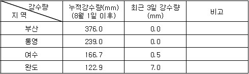 (Sept. 17. 2008) 2. 기상전망 (기상청 예보 자료) * 바람 및 파고 전망 오늘 남해서부에서 바람은 북동풍 내지 남동풍이 6~9m/sec, 파고는 1.0~2.0m 내외로 예상되며, 남해동부에서는 북동풍 내지 남동풍이 7~11m/sec, 파고는 1.0~2.0m로 예상됨. 내일은 남해서부에서 바람은 북동풍 내지 남동풍이 7~11m/sec, 파고는 1.0~2.0m 내외로 예상되며, 남해동부에서 바람은 북동풍 내지 남동풍이 8~12m/sec, 파고는 1.5~2.5m로 예상됨. * 특보 발효 현황 ㅇ 없 음 * 강수량