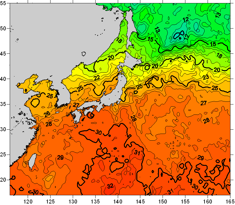 o 2008년 09월 12일 북서태평양 광역해양 수온분포 입니다. o 아래 위성 수온분포도는 국립수산과학원(NFRDI, Korea)과 일본동북대학교(Tohoku University, Japan)가 공동연구개발 진행중, 1차 연구결과인 것으로 구름의 영향을 배제한 신기술의 수온정보입니다.