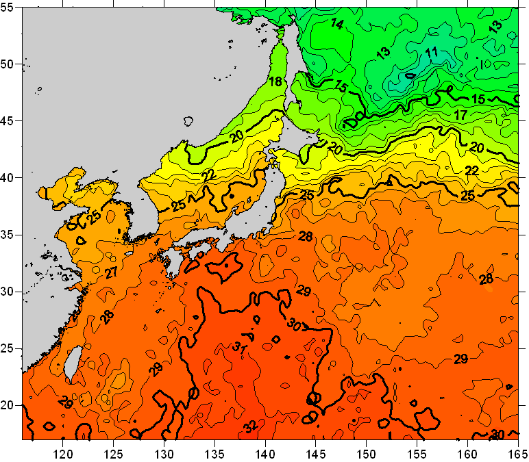o 2008년 09월 13일 북서태평양 광역해양 수온분포 입니다. o 아래 위성 수온분포도는 국립수산과학원(NFRDI, Korea)과 일본동북대학교(Tohoku University, Japan)가 공동연구개발 진행중, 1차 연구결과인 것으로 구름의 영향을 배제한 신기술의 수온정보입니다.