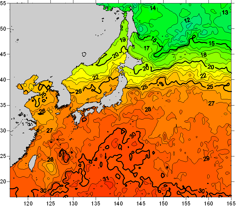 o 2008년 09월 14일 북서태평양 광역해양 수온분포 입니다. o 아래 위성 수온분포도는 국립수산과학원(NFRDI, Korea)과 일본동북대학교(Tohoku University, Japan)가 공동연구개발 진행중, 1차 연구결과인 것으로 구름의 영향을 배제한 신기술의 수온정보입니다.