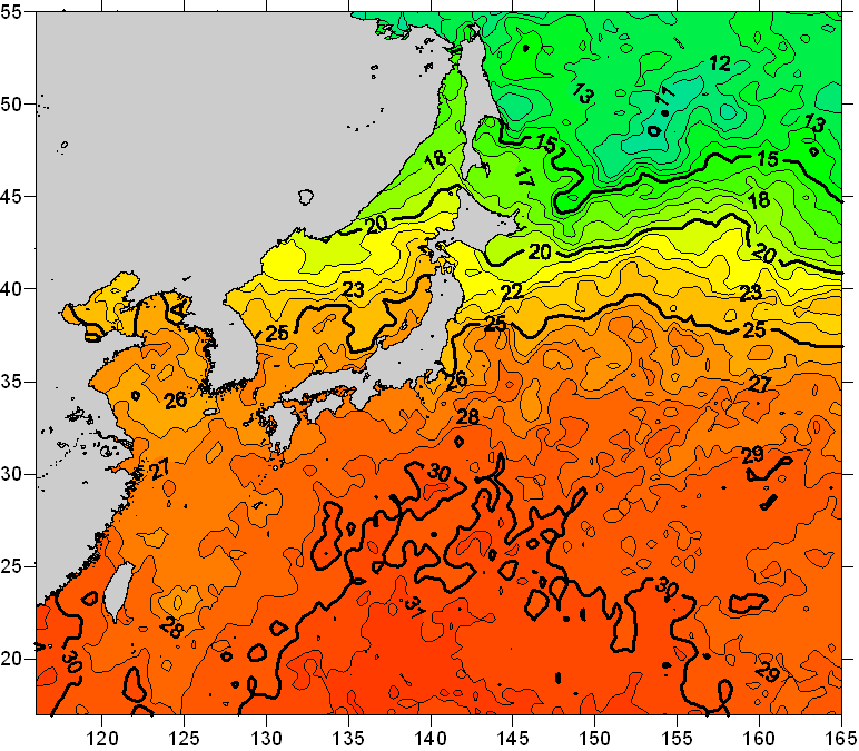o 2008년 09월 17일 북서태평양 광역해양 수온분포 입니다. o 아래 위성 수온분포도는 국립수산과학원(NFRDI, Korea)과 일본동북대학교 (Tohoku University, Japan)가 공동연구개발 진행중, 1차 연구결과인 것으로 구름의 영향을 배제한 신기술의 수온정보입니다.