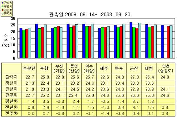 o 금주(2008.09.14~2008.09.20)의 한반도 연안 표면수온은 동해 연안역에서 섭씨 22~26도, 남해 연안역 22~26도, 서해 연안역에서 24~27도 내외로 나타납니다. o 평년에 비해 부산 비슷함을 제외한 동해 연안역은 1.5~3.5도 높게, 제주 0.5도 낮음을 제외한 남해 연안역은 1.5~2.5도 높게, 서해 연안역은 1.5~3.5도 높게 나타납니다. o 전년에 비해 동해 연안역은 주문진 1도 높게, 포항 2.5도 높게, 부산 1도 낮게 나타나며, 제주 1도 낮음을 제외한 남해 연안역은 1~1.5도 높게, 서해 연안역은 1~4도 높게 나타납니다.