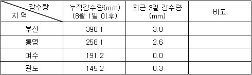 (Sept. 24. 2008) 2. 기상전망 (기상청 예보 자료) * 바람 및 파고 전망 오늘 남해서부에서 바람은 북동풍 내지 남동풍이 6~9m/sec, 파고는 0.5~1.5m 내외로 예상되며, 남해동부에서는 북동풍 내지 남동풍이 7~11m/sec, 파고는 1.0~1.5m로 예상됨. 내일은 남해서부에서 바람은 서풍 내지 북서풍이 6~9m/sec, 파고는 0.5~1.5m 내외로 예상되며, 남해동부에서 바람은 남서풍 내지 서풍이 8~12m/sec, 파고는 1.0~2.0m로 예상됨. * 특보 발효 현황 ㅇ 없 음 * 강수량