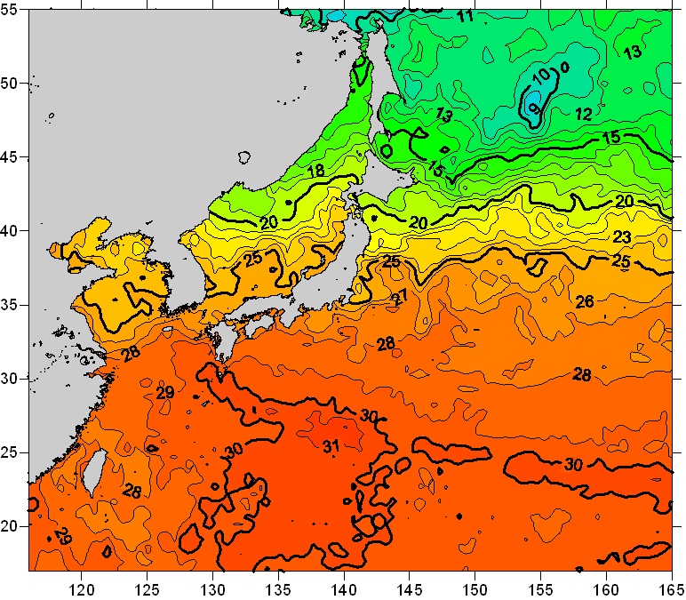o 2008년 09월 24일 북서태평양 광역해양 수온분포 입니다. o 아래 위성 수온분포도는 국립수산과학원(NFRDI, Korea)과 일본동북대학교 (Tohoku University, Japan)가 공동연구개발 진행중, 1차 연구결과인 것으로 구름의 영향을 배제한 신기술의 수온정보입니다.
