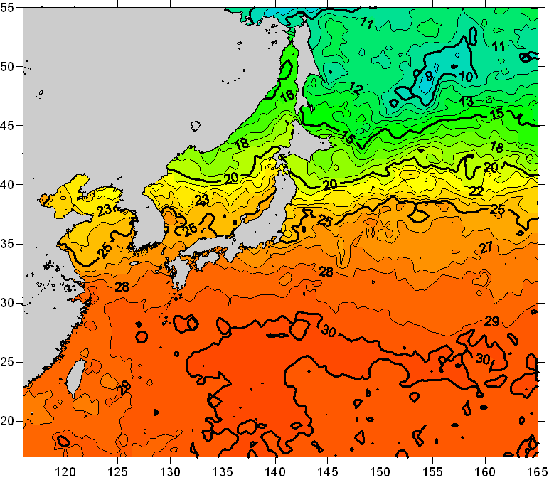 o 2008년 09월 25일 북서태평양 광역해양 수온분포 입니다. o 아래 위성 수온분포도는 국립수산과학원(NFRDI, Korea)과 일본동북대학교 (Tohoku University, Japan)가 공동연구개발 진행중, 1차 연구결과인 것으로 구름의 영향을 배제한 신기술의 수온정보입니다.