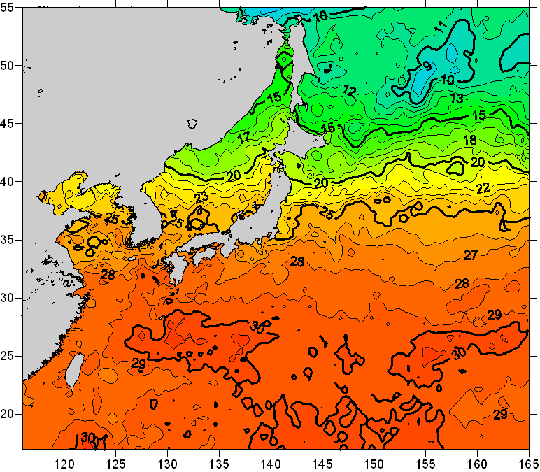 o 2008년 09월 26일 북서태평양 광역해양 수온분포 입니다. o 아래 위성 수온분포도는 국립수산과학원(NFRDI, Korea)과 일본동북대학교 (Tohoku University, Japan)가 공동연구개발 진행중, 1차 연구결과인 것으로 구름의 영향을 배제한 신기술의 수온정보입니다.
