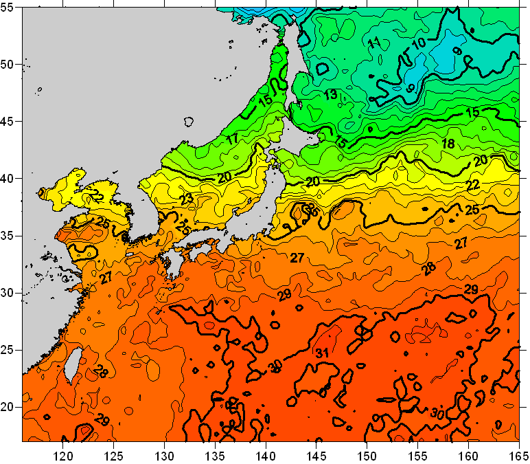 o 2008년 09월 27일 북서태평양 광역해양 수온분포 입니다. o 아래 위성 수온분포도는 국립수산과학원(NFRDI, Korea)과 일본동북대학교 (Tohoku University, Japan)가 공동연구개발 진행중, 1차 연구결과인 것으로 구름의 영향을 배제한 신기술의 수온정보입니다.