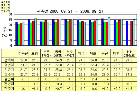 o 금주(2008.09.21~2008.09.27)의 한반도 연안 표면수온은 동해 연안역에서 섭씨 22~25도, 남해 연안역 24~26도, 서해 연안역에서 23~26도 내외로 나타납니다. o 평년에 비해 동해 연안역은 0.5~3도 높게, 남해 연안역은 1.5~2도 높게, 서해 연안역은 2~3.5도 높게 나타납니다. o 전년에 비해 동해 연안역은 주문진 및 포항 1도 높게, 부산 1도 낮게 나타나며, 통영 0.5도 낮음을 제외한 남해 연안역은 0.5~1.5도 높게, 인천 비슷함을 제외한 서해 연안역은 0.5~3도 높게 나타납니다.