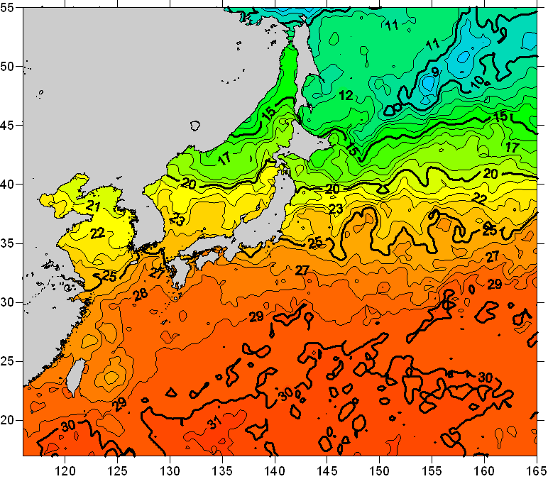 o 2008년 10월 01일 북서태평양 광역해양 수온분포 입니다. o 아래 위성 수온분포도는 국립수산과학원(NFRDI, Korea)과 일본동북대학교 (Tohoku University, Japan)가 공동연구개발 진행중, 1차 연구결과인 것으로 구름의 영향을 배제한 신기술의 수온정보입니다.
