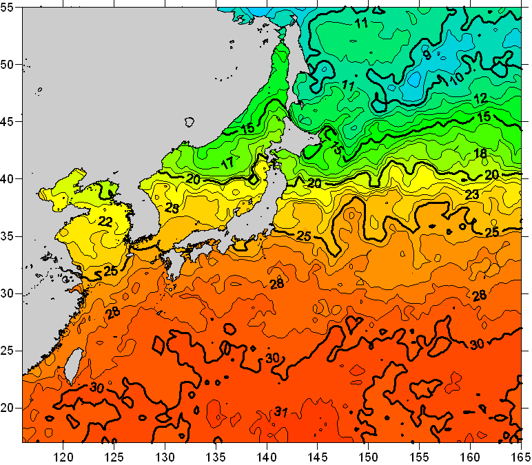 o 2008년 10월 04일 북서태평양 광역해양 수온분포 입니다. o 아래 위성 수온분포도는 국립수산과학원(NFRDI, Korea)과 일본동북대학교 (Tohoku University, Japan)가 공동연구개발 진행중, 1차 연구결과인 것으로 구름의 영향을 배제한 신기술의 수온정보입니다.