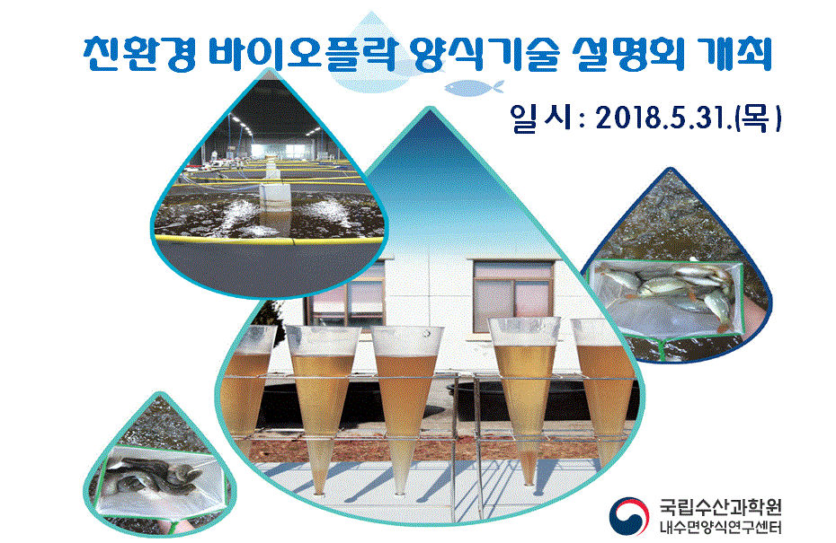 국립수산과학원 중앙내수면연구소 내수면양식연구센터에서는 내수면 양식현장의 애로사항을 신속하고 적극적으로 대응하고 내수면 양식 창업인 육성 및 양식기술의 현장보급을 위해서 “친환경 바이오플락 양식기술 설명회”를 아래와 같이 개최하오니 교육을 희망하는 분께서는 내수면양식연구센터(연구사 김나나, 055-540-2730, knana92@korea.kr)로 신청하여 주시기 바랍니다.