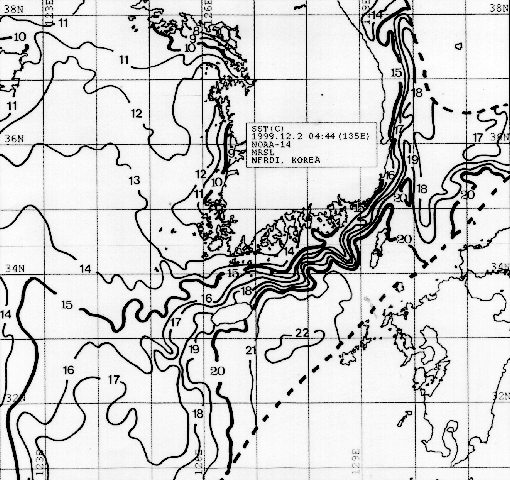 ㅇ1999년 12월 2일 04시 44분 현재의 표면수온분포도입니다.