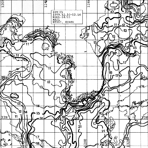ㅇ1999년 12월 10일부터 12월 14일까지 합성한 한국근해 수온분포도입니다.