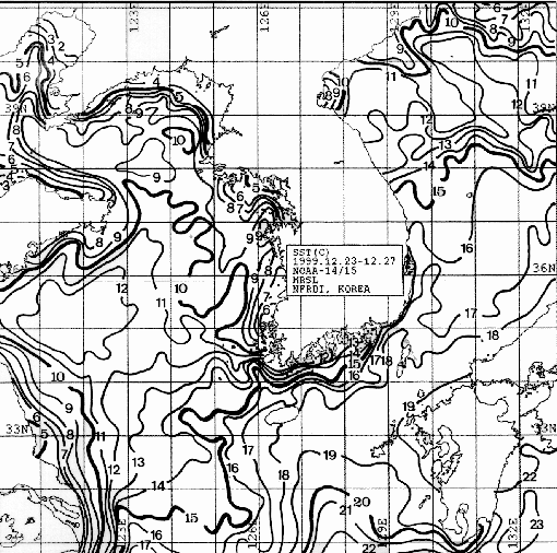 ㅇ1999년 12월 23일부터 12월 27일까지 합성한 한국근해 수온분포도입니다.