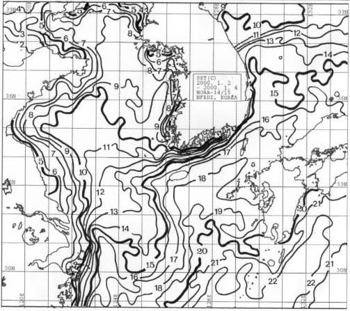 ㅇ2000년 1월 2일부터 4일까지 합성한 한국근해 수온분포도입니다.