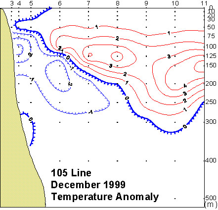 105선(묵호 동방)의 수직수온분포도 및 평년편차도 입니다.