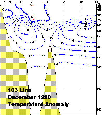 103선(영덕 동방)의 수직수온분포도 및 평년편차도 입니다.