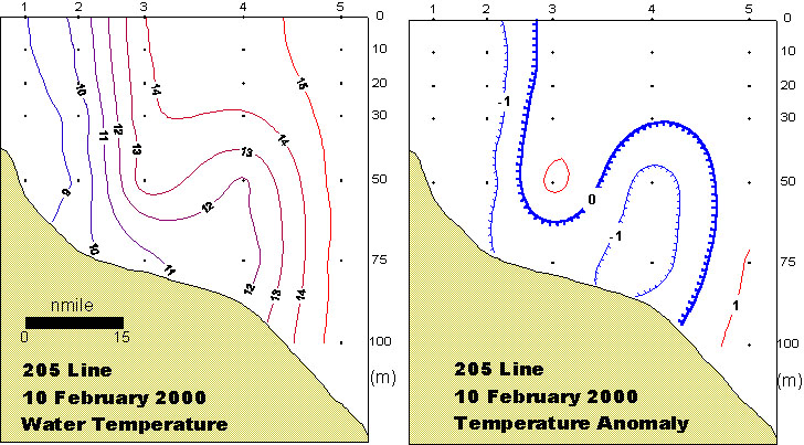 205선(여수남방)의 수직수온분포도 및 평년편차도 입니다.