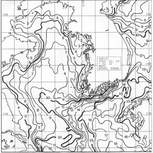 ㅇ 2000년 2월 18일부터 2월 22일까지 합성한 한국근해 수온분포도입니다.