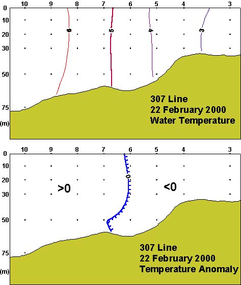 307선(태안반도 서방)의 수직수온분포도 및 평년편차도 입니다.