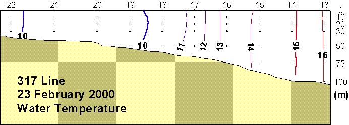 317선(동중국해 북부해역)의 수직수온분포도입니다.