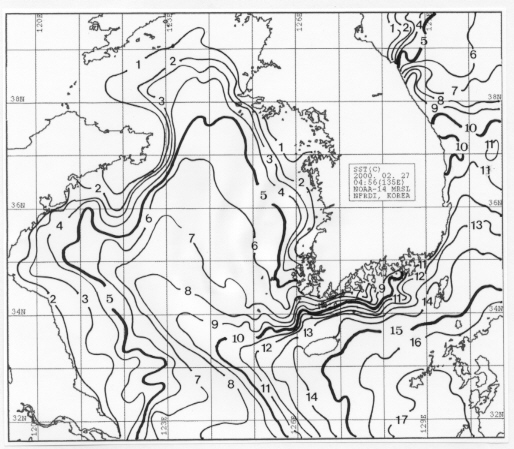 ㅇ 2000년 2월 27일 04시 56분 현재의 표면수온분포도입니다.