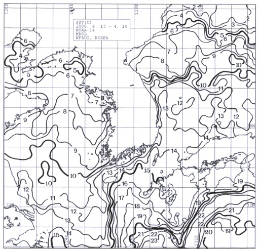 ㅇ2000년 4월 13일부터 4월 18일까지 합성한 한국근해 수온분포도입니다.