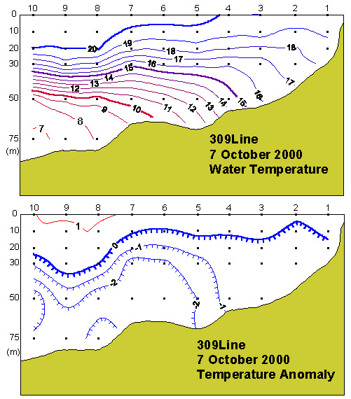 309선(군산 서방)의 수직수온분포도 및 평년편차도 입니다.