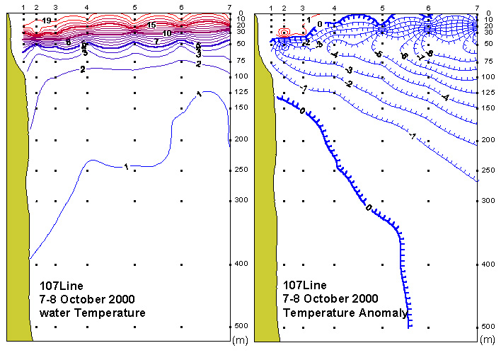 107선(속초 동방)의 수직수온분포도 및 평년편차도 입니다.
