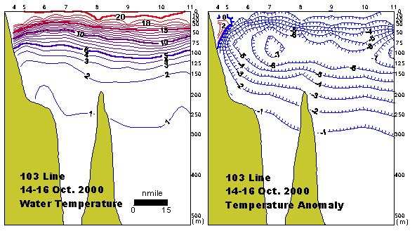 103선(영덕 동방)의 수직수온분포도 및 평년편차도 입니다.