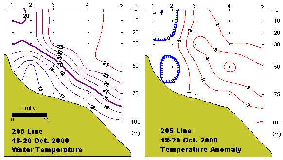 205선(여수남방)의 수직수온분포도 및 평년편차도 입니다.