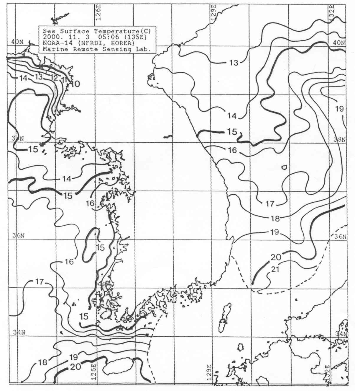 o 2000년 11월 3일 05시 06분 현재의 한국근해 광역수온 분포도입니다.