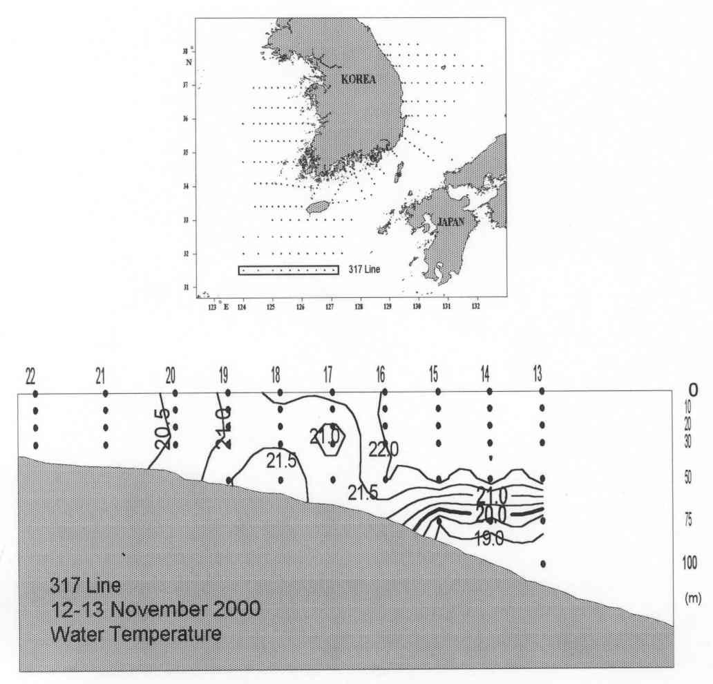 o 동중국해 서부해역의 수온은 20∼22도 범위로 상하혼합이 잘 이루어졌으나,