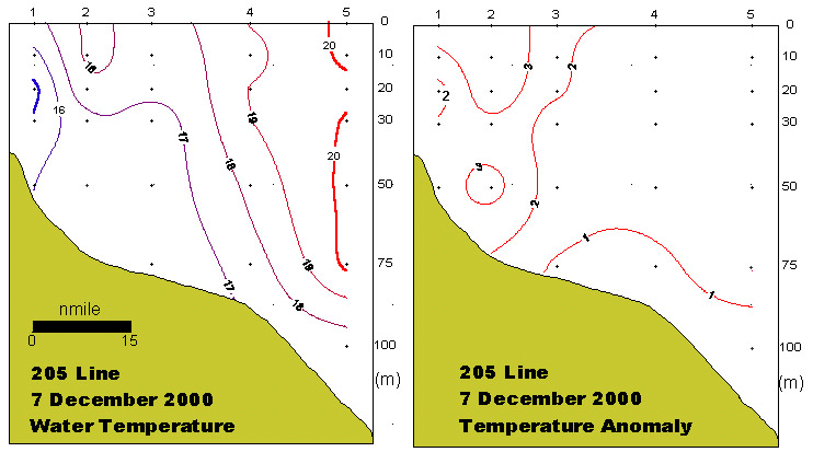 205선(여수남방)의 수직수온분포도 및 평년편차도 입니다.